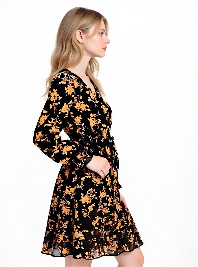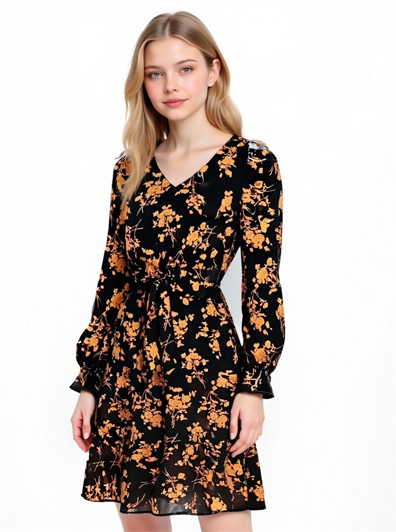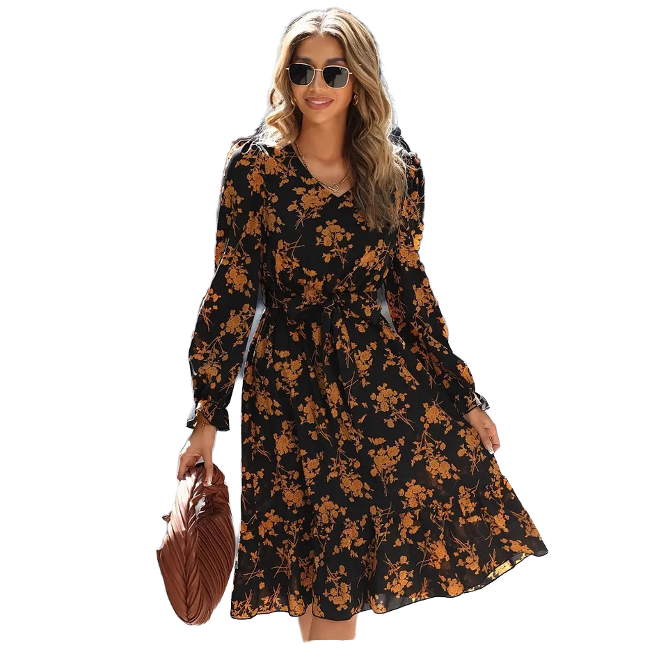 Be the first to review “Black Floral Print Midi Dress with Long Sleeves V-Neck Tie Waist Chiffon Dress”