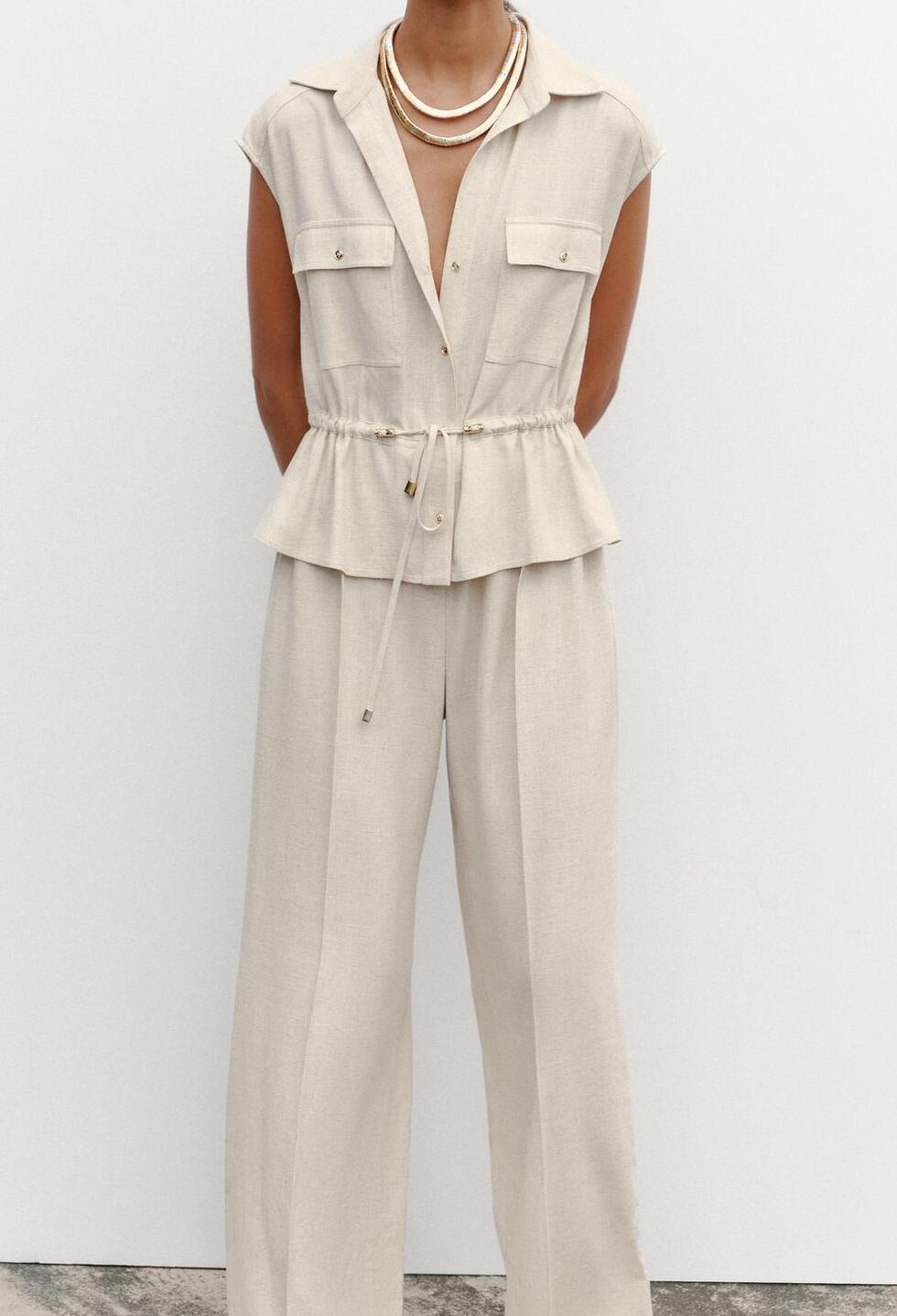 Be the first to review “Custom Elegant Beige Linen Sleeveless Blouse & Wide Leg Trousers for Daily Leg Pants Sets”