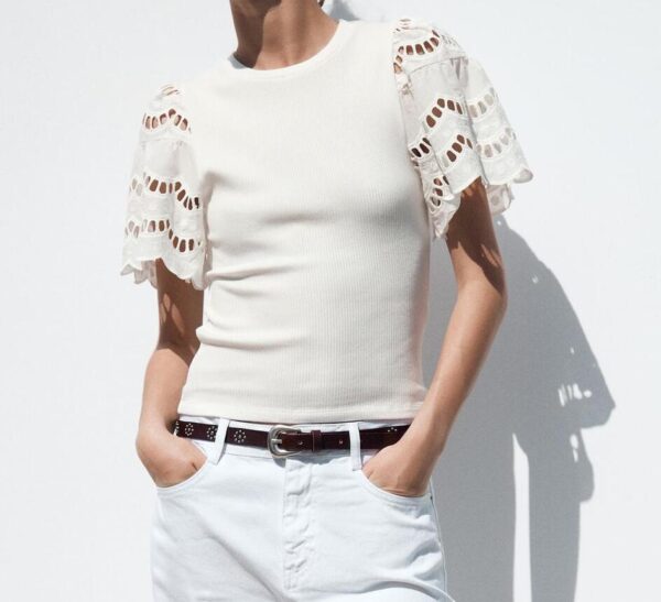 Be the first to review “Custom Chic White Top with Eyelet Embroidered Flutter Sleeves Elegant White Ribbed Top with Laser”