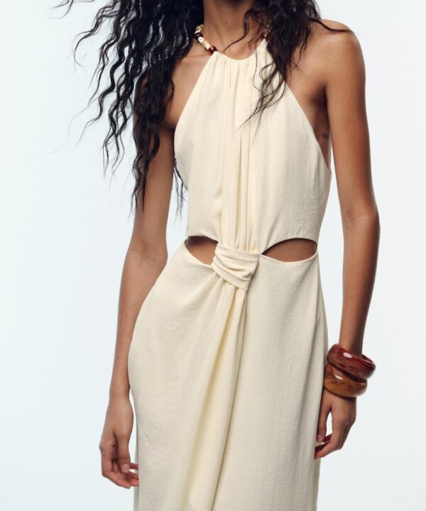 Be the first to review “Custom Cream Halter Dress with Cut Outs and Twist Detail Elegant Solid Linen Dress”