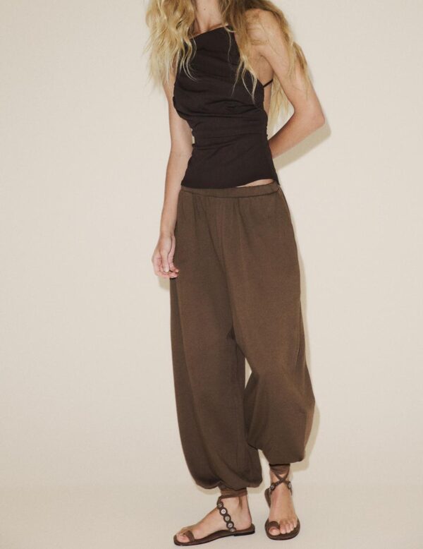 Custom Effortless Chic Asymmetric Black Shoulder Black Top + Brown Harem Pants Women Suits
