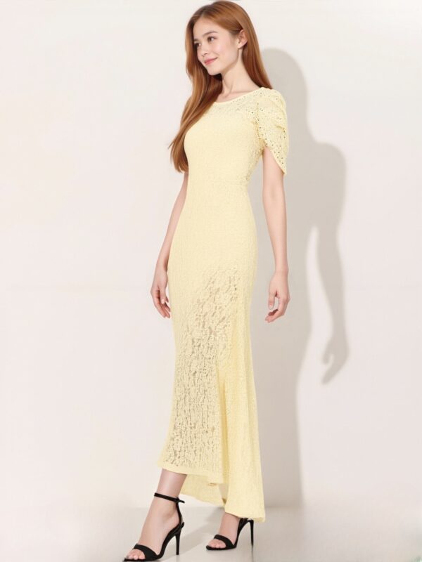 Be the first to review “Custom Pale Yellow Bodycon Lace Maxi Dress Unique Hem Puff Sleeve Detail Dresses”