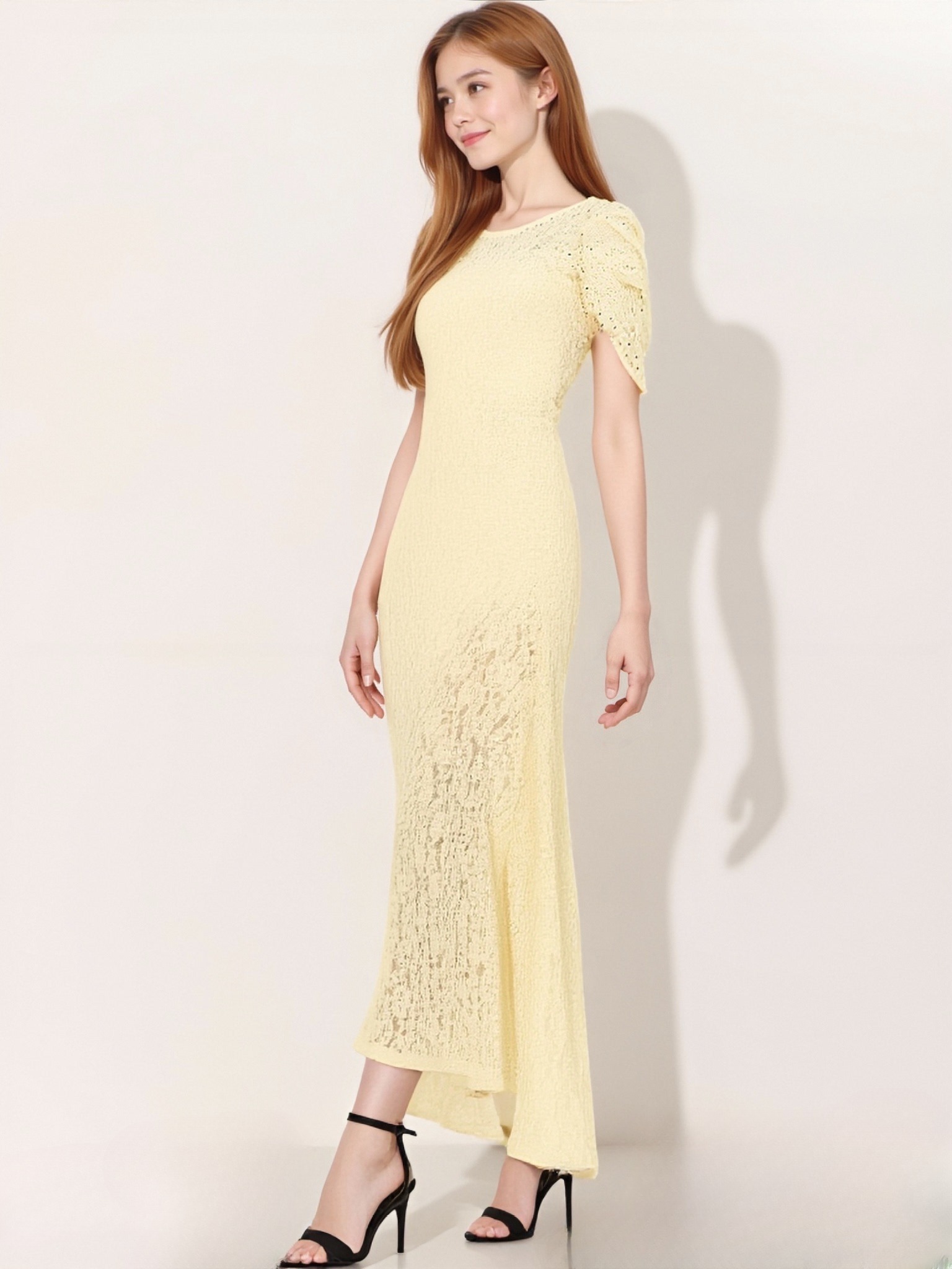 Custom Pale Yellow Bodycon Lace Maxi Dress Unique Hem Puff Sleeve Detail Dresses