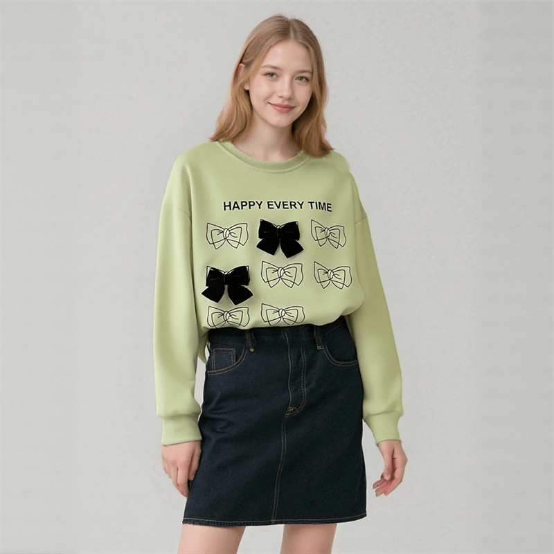 Customizable Light Green Bow-Embellished Sweatshirt Casual Top Dark Denim Mini Skirt