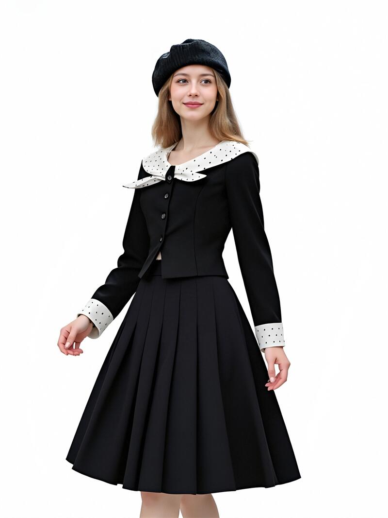 Vintage Black Two-Piece Set with Polka Dot Accents Elegant Cropped Jacket Pleated Midi Skirt