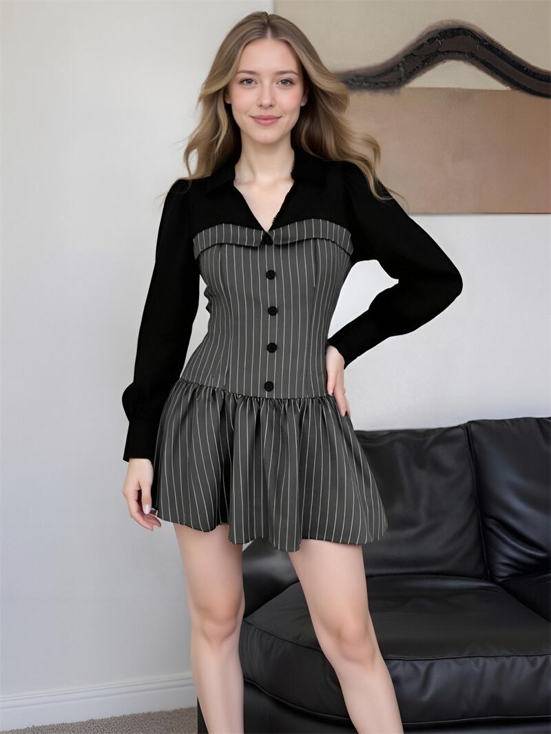 Women’s Vintage-Inspired Pinstripe Mini Dress with Black Contrast Collar Long Puff Sleeves